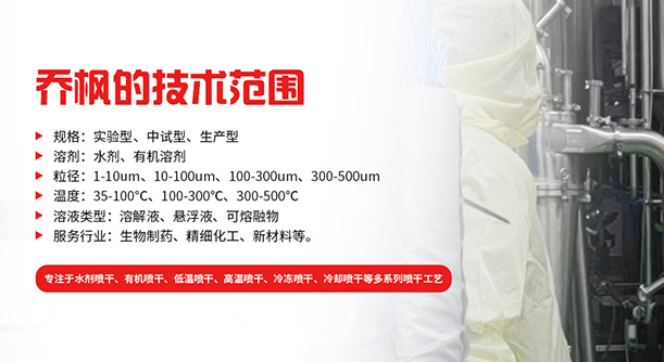 上海喬楓實業有限公司,成立于2012年,是從事噴霧干燥設備的研發設計、生產、銷售(小型噴霧干燥機,實驗型噴霧干燥機35℃低溫噴霧干燥機,有機溶劑噴霧干燥機,低溫閉式循環噴霧干燥機超細粉末噴霧干燥機、噴霧冷凍干燥機、真空噴霧干燥機、氣流噴霧干燥機噴霧造粒干燥機,離心噴霧干燥機,沸騰制粒機等)和售后于一體的綜合性公司,本公司現成為一家致力于為生物制藥、精細化工、新能源、陶瓷造粒及食品工程等領域提供全套解決方案的整線交鑰匙工程企業。